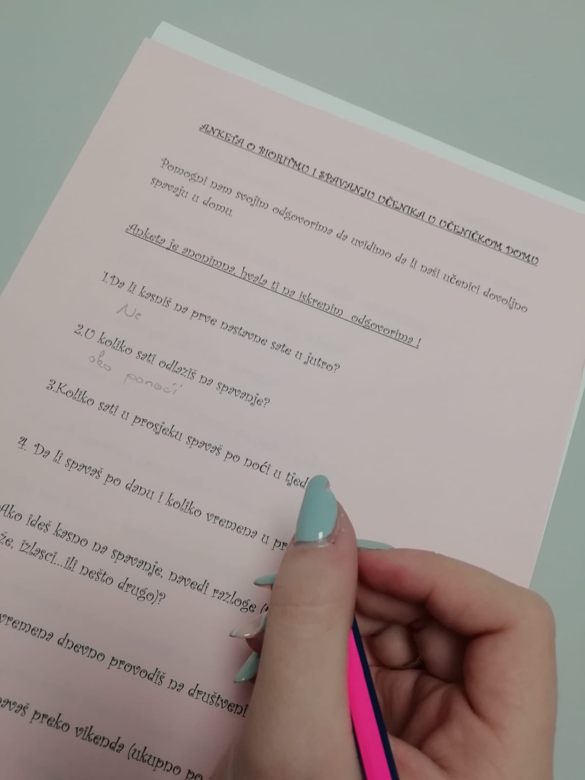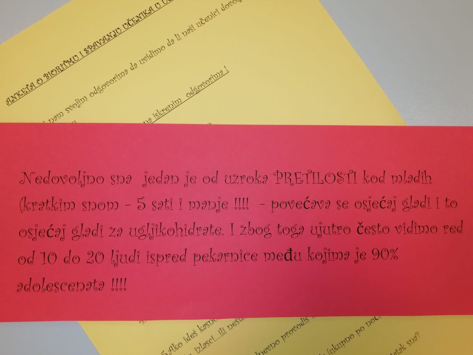 U tu svrhu proveli smo anketu među učenicama i učenicima i zamolili ih da odgovore (anonimno) na pitanja o duljini spavanja tokom noći, da li spavaju po danu, vremenu kada odlaze na spavanje, razlozima kasnog odlaska na spavanje, koliko spavaju preko vikenda i da li uspiju nadoknaditi propušten san...