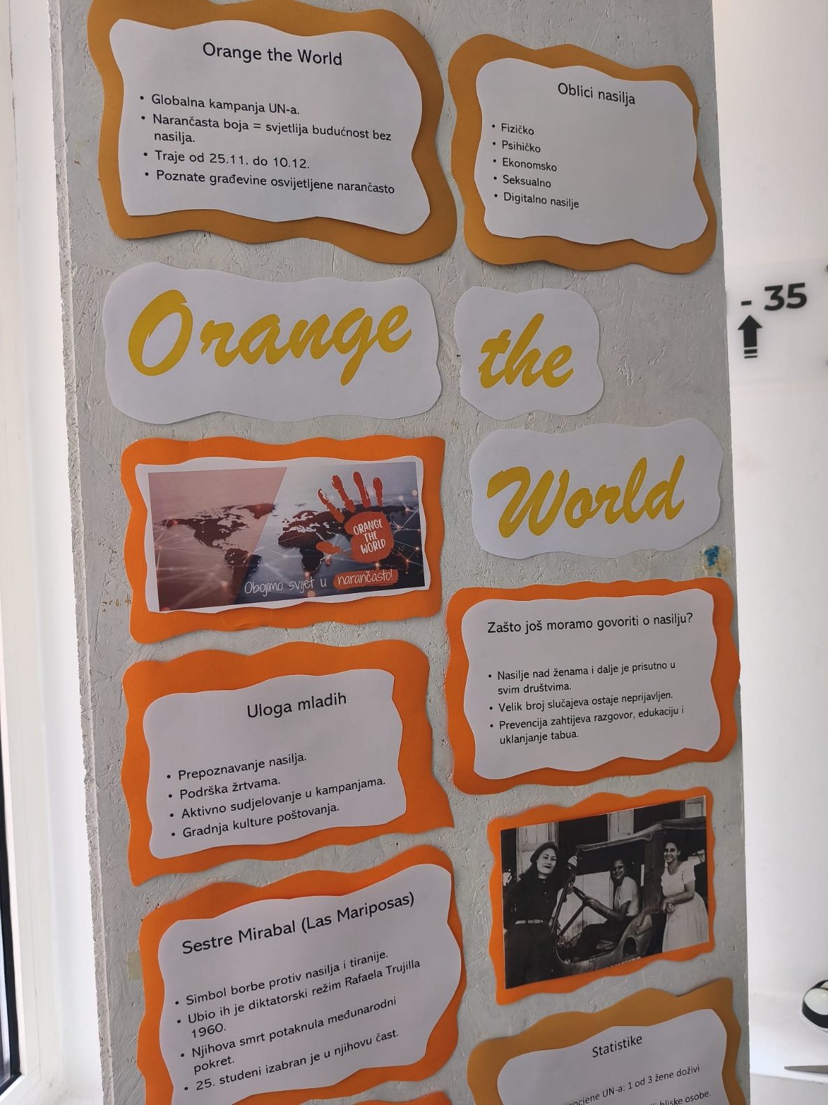 Kroz kratku raspravu učenici su razgovarali o problemu nasilja nad ženama, uz poseban naglasak na važnost prepoznavanja znakova nasilja i ulogu mladih u stvaranju sigurnijeg i podržavajućeg okruženja. Nakon rasprave, izradili smo edukativni pano kojim smo simbolično poslali poruku podrške te potaknuli vršnjake na promišljanje i aktivno djelovanje.